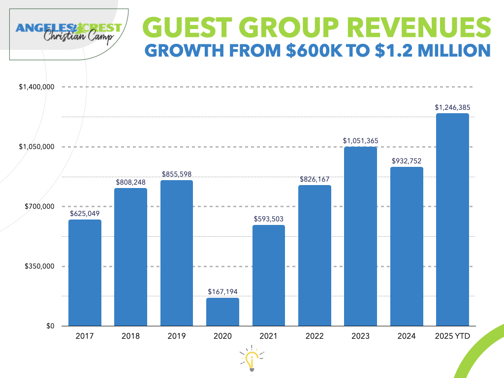 “We’ve gone from 4,000 to 6,500 people annually and grown from $600,000 to over $1.2 million in guest group revenue and from $800,000 to over $2 million in total revenue,” Dave explains. “Now our revenue is stable and predictable. 2025 was a record year for us, and 2026 looks like it will exceed even that.”